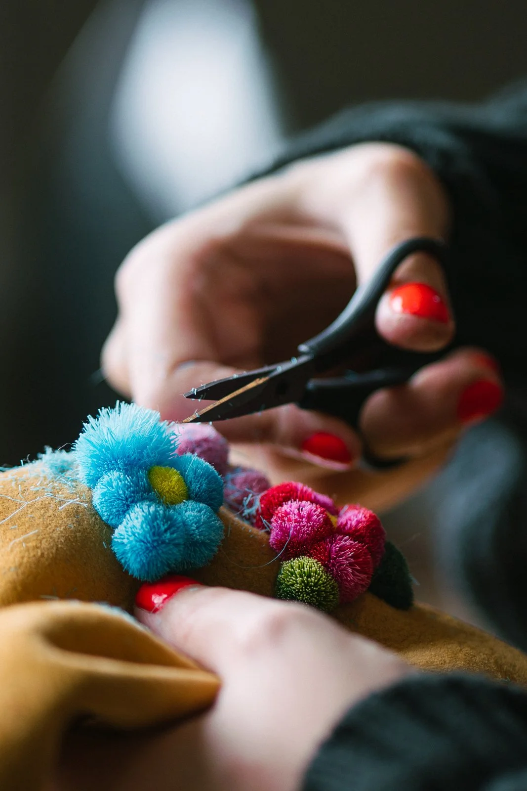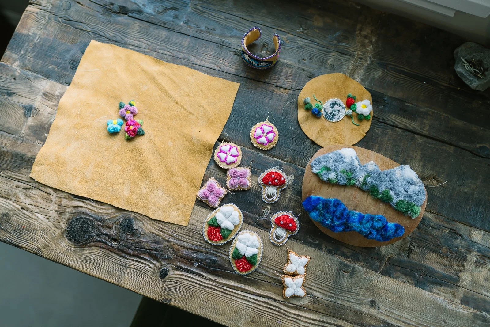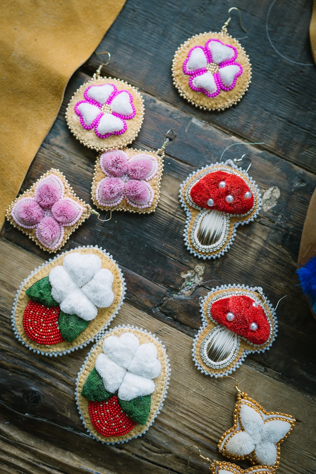 Carly’s signature tufted mushroom earrings are inspired by her deep connection to the land. Each pair is hand-tufted using hand-dyed Canadian caribou hair, paired with beadwork and natural materials that reflect the textures and quiet growth found in nature. Mushrooms symbolize connection, regeneration, and life beneath the surface, a reminder that much of what sustains us exists out of sight. These earrings are made slowly and intentionally, carrying stories of land, tradition, and care.
